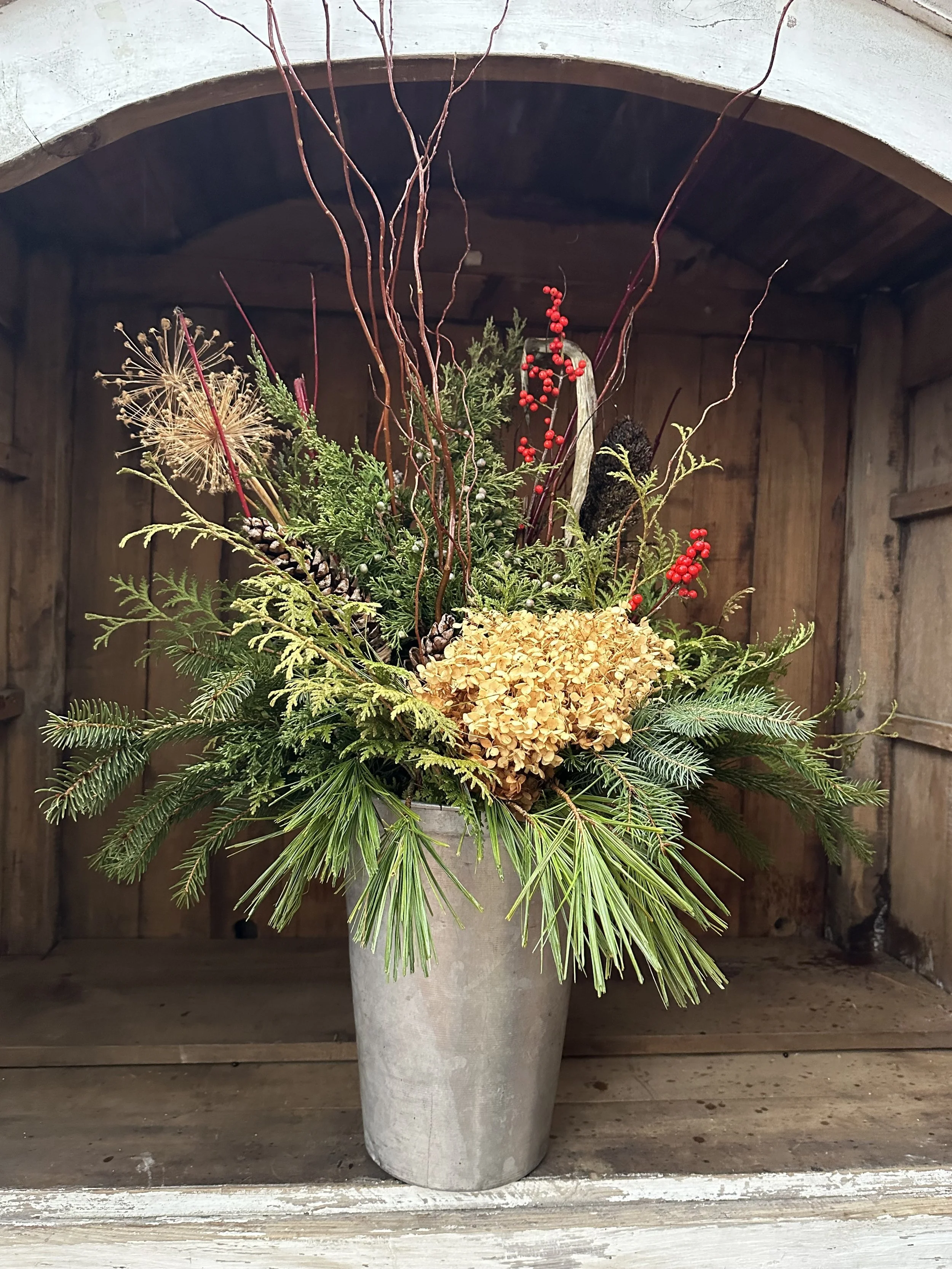 Inspired by nature our porch arrangement are created with a variety of fresh greens, dried flowers, berries and pinecones.